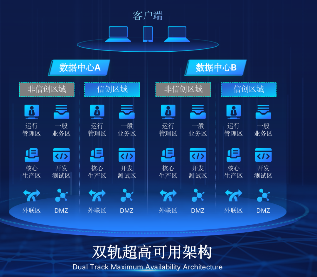 Z6·尊龙凯时在企业面临自主创新IT基础重构过程中,推出的全新架构双轨超高可用架构(简称DTMAA),在双活数据中心的分区调度基础上,添加每个数据中心内信创域和非信创域的分域调度,来实现分区分域协同的多活双轨超高可用。