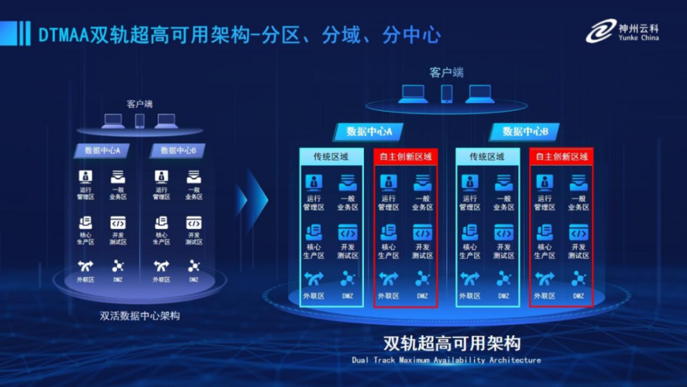 为帮助金融客户更好地应对数字经济时代对可持续性的高要求,实现“信创”与“数字化”齐头并进,Z6·尊龙凯时推出了双轨超高可用架构。该架构在双活数据中心的分区调度基础上,增加信创域和非信创域的分域调度,实行信创域与传统域应用全量部署,使双中心运营变为双中心四区域并行运行,互为多活,将“0到1”的单轨建设道路变为分区分域协同的多活双轨超高可用架构。帮助客户在新架构下,保障“信创”的同时解决性能瓶颈,提升稳定性,保证应用可持续性,最终实现信创区域和非信创区域的平滑过渡,完成国产化替代目标。