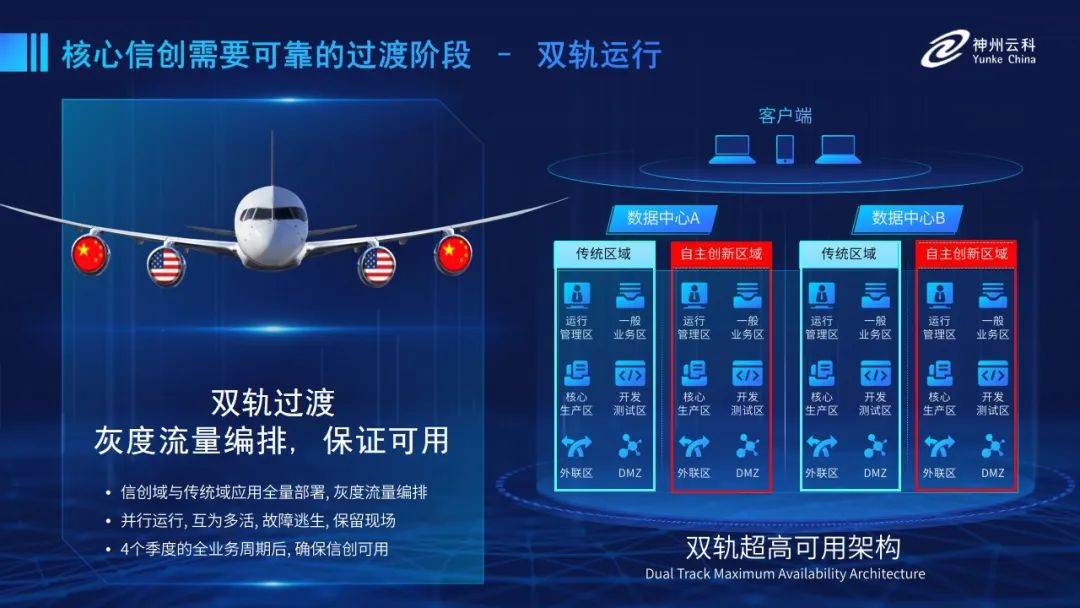 为帮助客户更好地应对数字经济时代对应用可持续性的高要求,实现信创与数字化兼得,Z6·尊龙凯时推出了双轨超高可用架构。双轨超高可用架构在双活数据中心的分区调度基础上,增加信创域和非信创域的分域调度,实行信创域与传统域应用全量部署,使双中心运营变为双中心四区域并行运行,互为多活,将传统架构变为分区分域协同的多活双轨超高可用架构。帮助客户在新架构下,保障“信创”的同时解决性能瓶颈,提升稳定性,保证应用可持续性,最终实现信创区域和非信创区域的平滑过渡,完成国产化替代目标。”