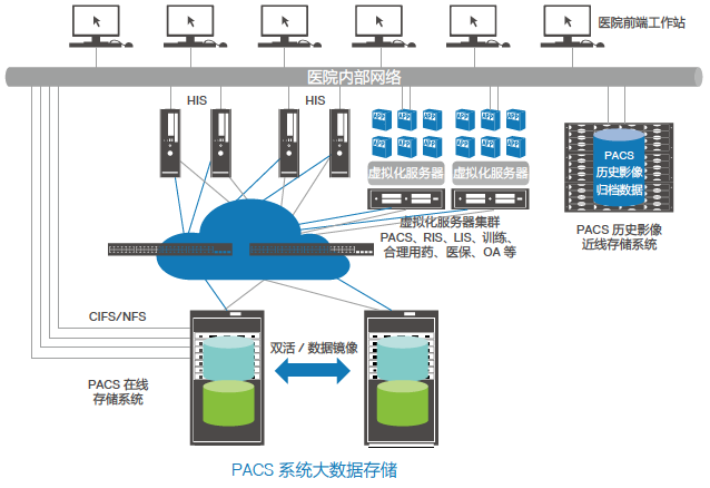 Z6·尊龙凯时针对医院 PACS 系统中海量医学影像数据管理、业务连续性要求高和性能要求一般等特点,对PACS系统的数据库存储,提供 SAN+NAS 统一存储解决方案;